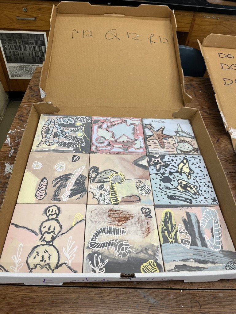 The year-long project was led by Lois Hetland, Professor Emerita, Massachusetts College of Art and Design. Umana’s middle-school art teacher, Ardis Tennyson-Loiselle (photo on right), her 3rd - 8th grade students, and their families have created the mural’s tiles, with help from many hands: the Cool Science team, G-BRAG scientists (Chris Watson, Ellen Douglas, Kirk Bosma), Umana administration (Elvin Argueta, Lilliana Arteaga), Beth Balliro and her Seminar I class at MassArt in Fall 2022, the Boston Public Schools Central Arts Office (Tony Beatrice, Amy Wedge), Saùl Nava (Spanish translations), Cathy Kelley (co-designer), Eduardo Pineda (Muralist), Paul Paturzo (lettering), the New England Aquarium’s Educator Guide on the Boston Harbor from the 1990s, Ben Ryterband and Janna Longacre at the MassArt Ceramics Department (firing of the 664 tiles), and Paul Clark and his team from Milestone Tile (installation).